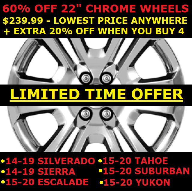 World Parts Direct is having a very special fire sale on 84346101 22” 6 split-spoke chrome wheels. For a limited time, these gorgeous chrome Rims are for sale at the lowest price in the country. If you have been thinking about upgrading your 14 – 20 Escalade, Avalanche, Yukon, Sierra, Blazer, Tahoe, Silverado or Suburban… Read more